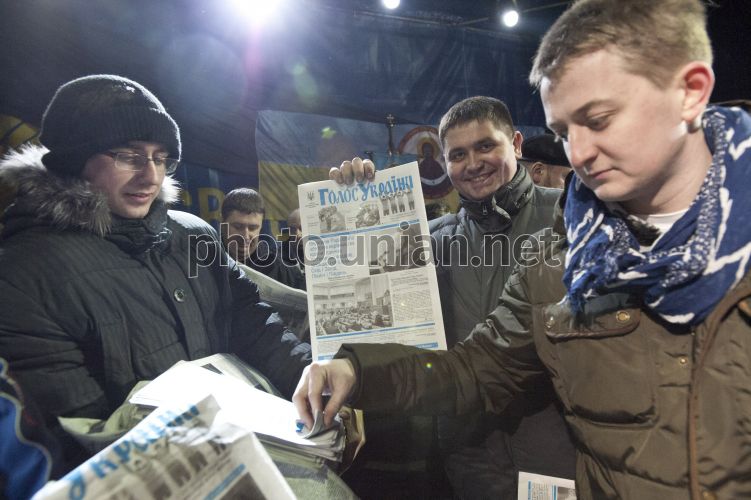 Спецвыпуск газеты "Голос Украины" раздавали митингующим на Майдане Незалежности в Киеве, в субботу, 22 февраля 2014 г. В спецвыпуске "Голоса Украины" напечатаны постановления Верховной Рады про увольнения и назначения представителей власти. Фото Анастасии Сироткиной / УНИАН
