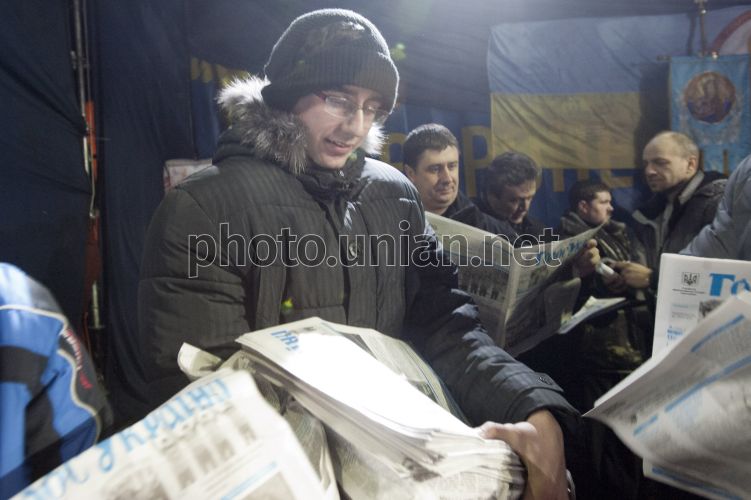 Спецвыпуск газеты "Голос Украины" раздавали митингующим на Майдане Незалежности в Киеве, в субботу, 22 февраля 2014 г. В спецвыпуске "Голоса Украины" напечатаны постановления Верховной Рады про увольнения и назначения представителей власти. Фото Анастасии Сироткиной / УНИАН