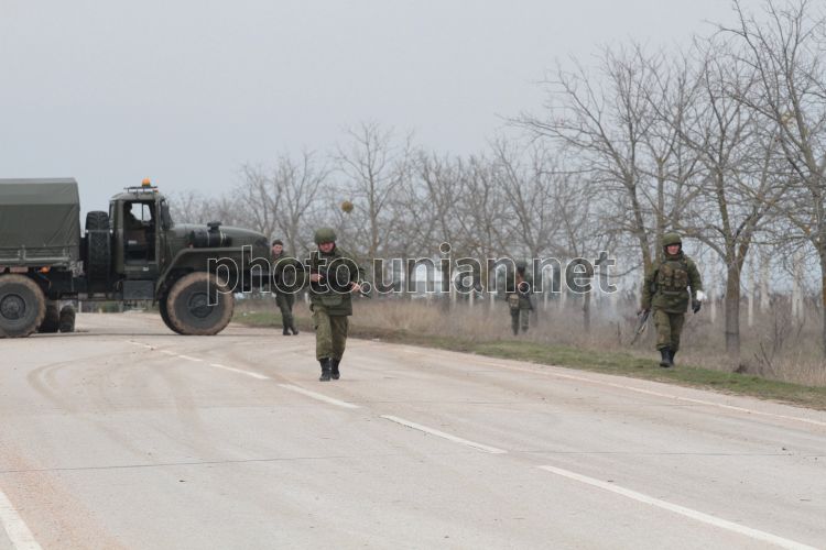 Российские военнослужащие перекрыли подъезд к аэропорту "Бельбек" возле Севастополя (АР Крым), в субботу, 1 марта 2014 г. Совет Федерации России единогласно принял предложение президента России Владимира Путина о введении войск в Украину. Фото Алексея Сувирова / УНИАН