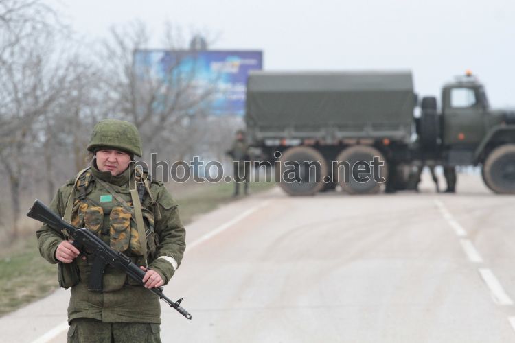 Российские военнослужащие перекрыли подъезд к аэропорту "Бельбек" возле Севастополя (АР Крым), в субботу, 1 марта 2014 г. Совет Федерации России единогласно принял предложение президента России Владимира Путина о введении войск в Украину. Фото Алексея Сувирова / УНИАН