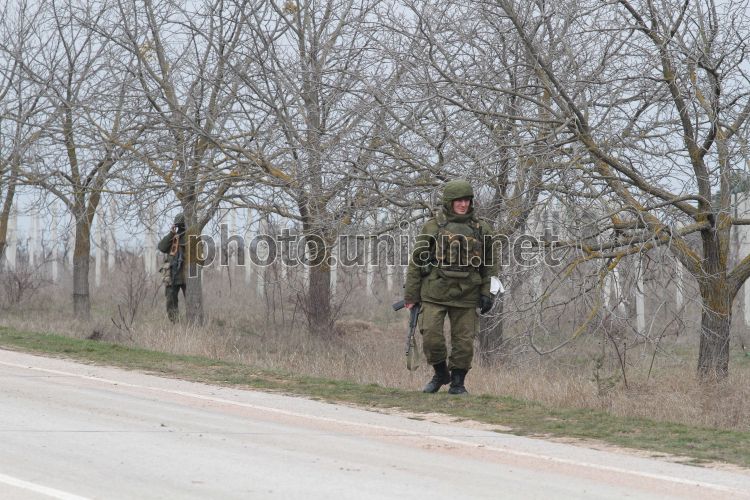 Российские военнослужащие перекрыли подъезд к аэропорту "Бельбек" возле Севастополя (АР Крым), в субботу, 1 марта 2014 г. Совет Федерации России единогласно принял предложение президента России Владимира Путина о введении войск в Украину. Фото Алексея Сувирова / УНИАН