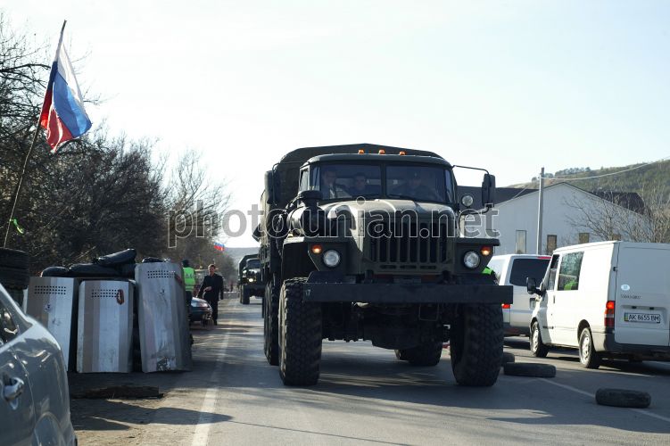 Автомобиль без номеров проезжает через блокпост рядом с аэропортом "Бельбек" возле Севастополя (АР Крым), в понедельник, 3 марта 2014 г. Совет Федерации России единогласно принял предложение президента России Владимира Путина о введении войск в Украину. Фото Макса Рокотанского / УНИАН