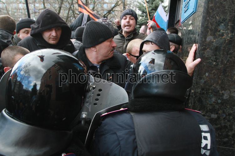 Пророссийские активисты возле здания областной прокуратуры в Донецке, в воскресенье, 16 марта 2014 г. В Донецке пророссийские активисты сначала штурмовали и прорвались в здание областной прокуратуры, потом - в здание Управления СБУ.Фото УНИАН