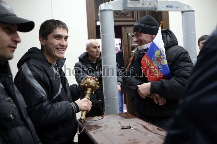 Пророссийские активисты в здании областной прокуратуры в Донецке, в воскресенье, 16 марта 2014 г. В Донецке пророссийские активисты сначала штурмовали и прорвались в здание областной прокуратуры, потом - в здание Управления СБУ. Фото Даниила Павлова / УНИАН