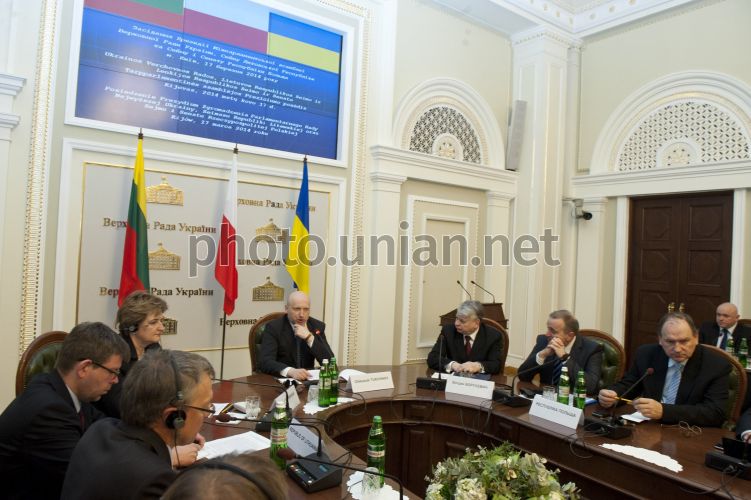 Председатель Сейма Литовской Республики Лорета Граужинене, председатель Верховной Рады Украины, и.о. Президента Украины Александр Турчинов и председатель Сената Республики Польша Богдан Борусевич во время заседания президиума Межпарламентской ассамблеи трех стран в Киеве, в понедельник, 17 марта 2014 г. В этот день в Киеве состоялось заседание президиума Межпарламентской ассамблеи Верховной Рады Украины, Сейма Литовской Республики и Сейма и Сената Республики Польша. Фото Анастасии Сироткиной / POOL / УНИАН