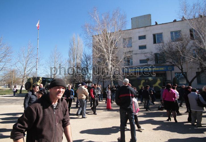 Местные жители на территории в/ч А1100 (морская авиабригада ВМС Украины) в поселке Новофедоровка Сакского района Крыма, в субботу, 22 марта 2014 г. Командиру воинской части А1100 в Новофедоровке выдвинули ультиматум: если часть не будет сдана до 13:00, будет штурм. Фото Алексея Сувирова / УНИАН