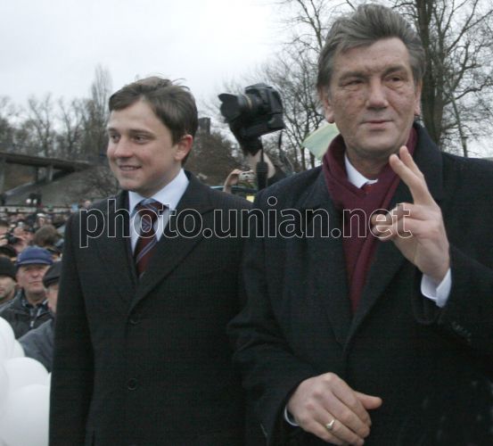 COMM Президент Украины Виктор Ющенко, справа, и заместитель киевского мэра, секретарь Киевсовета Олесь Довгий во время ежегодного православного праздника Крещения Господня в Киеве в пятницу, 19 января 2007 г. В этот день все православные христиане и греко-католики отмечают Крещение Господнее. Верующие вспоминают о том, как в возрасте 30 лет Иисус из Галилеи пришел к реке Иордан, чтобы принять крещение водой от Иоанна Предтечи. Фото Евгения Орловского / УНИАН