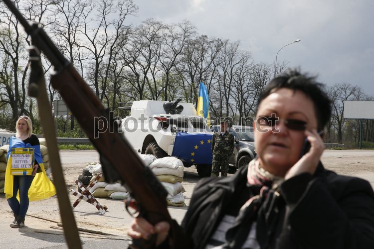 Женщина держит автомат на блок-посту на въезде в Борисполь, во вторник, 22 апреля 2014 г. На въезде в Борисполь из стороны Харьковской трассы Самооборона и Патрульная служба поставили блокпост, который охраняет боевая разведывательно-дозорная машина (БРДМ). Фото Владимира Гонтара / УНИАН
