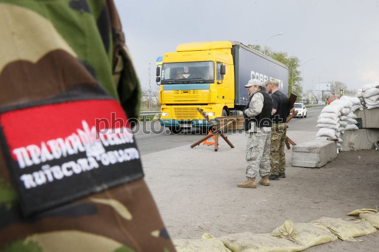 Блок-пост на въезде в Борисполь, во вторник, 22 апреля 2014 г. На въезде в Борисполь из стороны Харьковской трассы Самооборона и Патрульная служба поставили блокпост, который охраняет боевая разведывательно-дозорная машина (БРДМ). Фото Владимира Гонтара / УНИАН