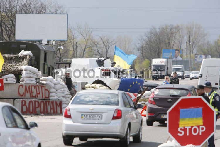 Блок-пост на въезде в Борисполь, во вторник, 22 апреля 2014 г. На въезде в Борисполь из стороны Харьковской трассы Самооборона и Патрульная служба поставили блокпост, который охраняет боевая разведывательно-дозорная машина (БРДМ). Фото Владимира Гонтара / УНИАН