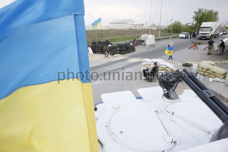 Блок-пост на въезде в Борисполь, во вторник, 22 апреля 2014 г. На въезде в Борисполь из стороны Харьковской трассы Самооборона и Патрульная служба поставили блокпост, который охраняет боевая разведывательно-дозорная машина (БРДМ). Фото Владимира Гонтара / УНИАН