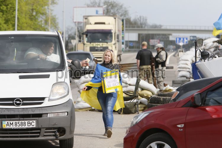 Женщина собирает деньги на нужды блок-поста на въезде в Борисполь, во вторник, 22 апреля 2014 г. На въезде в Борисполь из стороны Харьковской трассы Самооборона и Патрульная служба поставили блокпост, который охраняет боевая разведывательно-дозорная машина (БРДМ). Фото Владимира Гонтара / УНИАН