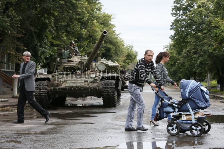 Люди переходят через дорогу возле украинского танка в освобожденном от террористов Славянске (Донецкая обл.), во вторник, 8 июля 2014 г. 5 июля украинские силовики освободили от террористов Славянск, который был захвачен в середине апреля. Фото Владимира Гонтара / УНИАН