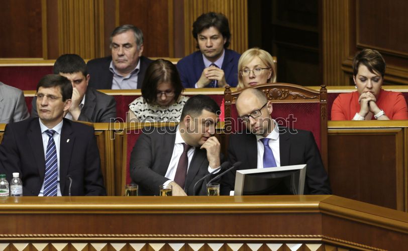 Премьер-министр Украины Арсений Яценюк в правительственной ложе во время заседания Верховной Рады Украины в Киеве, в четверг, 24 июля 2014 г. Премьер-министр Украины Арсений Яценюк подал в отставку «в связи с распадом коалиции и блокировкой правительственных инициатив». Фото Александра Синицы / УНИАН