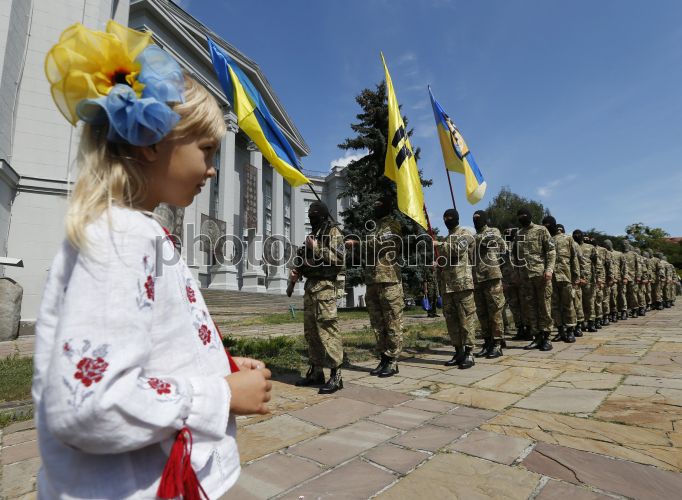 Бойцы батальона "Азов" во время проводов в зону АТО в Киеве, в воскресенье, 17 августа 2014 г. Фото Владислава Мусиенко / УНИАН