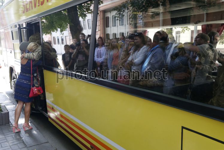 Бойцы батальона "Азов" в автобусе во время проводов в зону АТО в Киеве, в воскресенье, 17 августа 2014 г. Фото Владислава Мусиенко / УНИАН