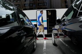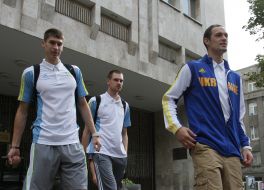 Игроки сборной Украины по баскетболу Артем Пустовой, слева, и Александр Мишула, в Киеве, во вторник, 26 августа 2014 г. Мужская сборная Украины по баскетболу отправилась на Чемпионат мира в Испанию, который пройдет 30 августа - 14 сентября. Фото УНИАН