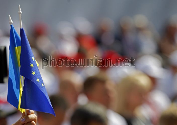 Флажки Украины и Евросоюза во время XIII съезда партии «Батькивщины» в Киеве, в воскресенье, 14 сентября 2014 г. Фото УНИАН