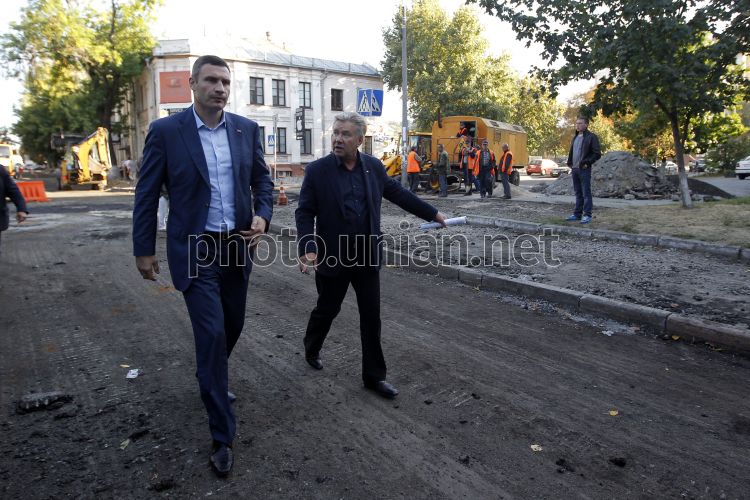 Мэр Киева Виталий Кличко, слева, во время ознакомления с ходом ремонтных работ по ул. Межигорской в Киеве, во вторник, 16 сентября 2014 г. Фото Андрея Скакодуба / POOL / УНИАН