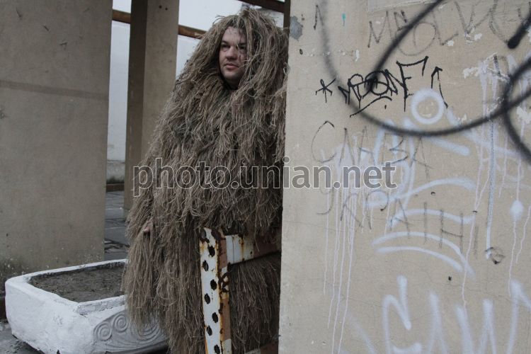 Мужчина демонстрирует маскировочный костюм снайпера "Кикимора", который сделали волонтеры, в Киеве, в понедельник, 17 ноября 2014 г. Фото Виктора Ковальчука / УНИАН