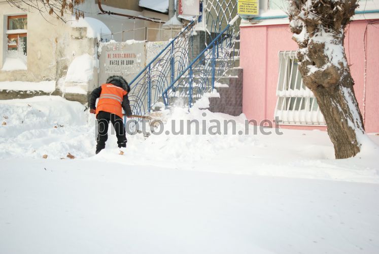 Работник коммунальных служб убирает снег возле здания, в Николаеве, во вторник 30 декабря 2014 г. В Николаеве трамваи и тролейбусы 30 декабря не вышли на маршруты из-за снега. В Николаевской области из-за непогоды обесточены 70 населенных пунктов. Фото Юрия Багрянцева / УНИАН