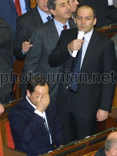 Лидер фракции партий "Трудовая Украина"- Промышленников и предпринимателей Украины Сергей Тигипко, слева, размышляет в зале заседаний Верховной Рады Украины в Киеве в четверг, 12 декабря 2002г. Справа - член фракции партий ППУ -"Трудовая Украина" Виктор Пинчук. В этот день на столе председателя ВР появилось письмо, подписанное Тигипко, в котором тот просит спикера ВР снять с рассмотрения ВР вопрос о его избрании председателем Национального банка Украины. В этот же день член фракции партий ППУ -"Трудовая Украина" Игорь Шаров заявил, что письмо является провокацией.
