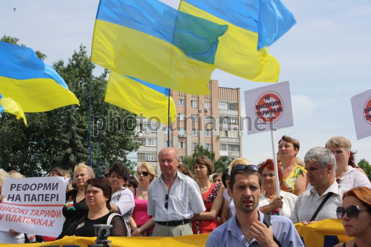 Участники акции "Нет - тарифному террору против украинцев" возле здания Житомирской облгосадминистрации, 26 июня 2015 г. Фото Юхимчук Зоя / УНИАН