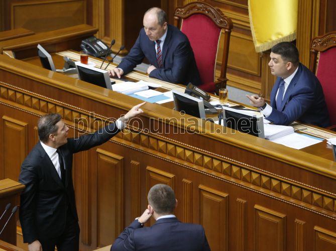 Первый заместитель председателя ВРУ Андрей Парубий, первый слева, председатель Верховной Рады, председатель Конституционной комиссии Владимир Гройсман, справа, и лидер Радикальной партии Олег Ляшко, в центре, во время заседания Верховной Рады Украины в Киеве, 30 июня 2015 г. Фото Мусиенко Владислав / УНИАН