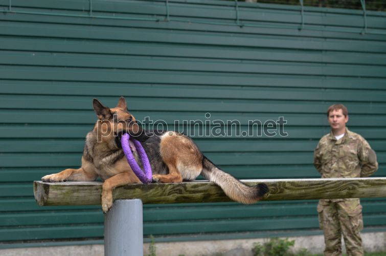 Руководитель кинологического центра "Межигорье" Николай Гарус с овчаркой во время передачи кинологическим центром, расположенном в Межигорье, пограничному ведомству немецких овчарок, которые будут использоваться в служебной деятельности на государственной границе и в зоне проведения АТО, в Межигорье, 30 июля 2015 г. Фото Нужненко Сергей / УНИАН