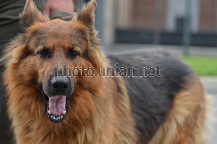 Собака породы овчарка во время передачи кинологическим центром, расположенном в Межигорье, пограничному ведомству немецких овчарок, которые будут использоваться в служебной деятельности на государственной границе и в зоне проведения АТО, в Межигорье, 30 июля 2015 г. Фото Нужненко Сергей / УНИАН