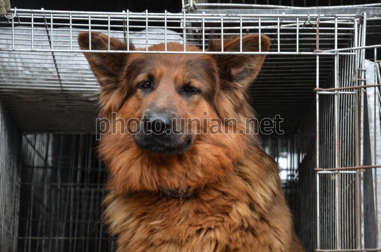 Собака породы овчарка во время передачи кинологическим центром, расположенном в Межигорье, пограничному ведомству немецких овчарок, которые будут использоваться в служебной деятельности на государственной границе и в зоне проведения АТО, в Межигорье, 30 июля 2015 г. Фото Нужненко Сергей / УНИАН