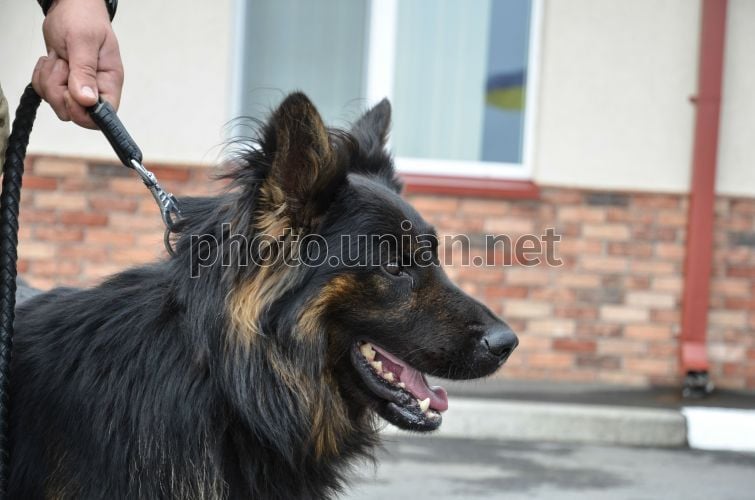 Собака породы овчарка во время передачи кинологическим центром, расположенном в Межигорье, пограничному ведомству немецких овчарок, которые будут использоваться в служебной деятельности на государственной границе и в зоне проведения АТО, в Межигорье, 30 июля 2015 г. Фото Нужненко Сергей / УНИАН