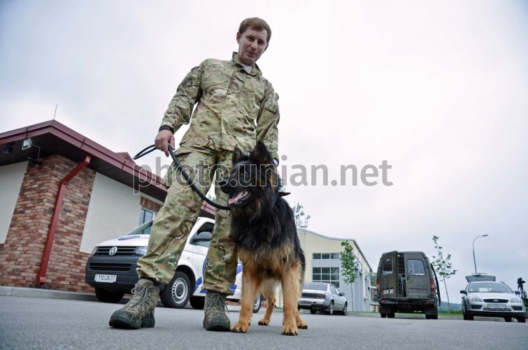 Руководитель кинологического центра "Межигорье" Николай Гарус с овчаркой во время передачи кинологическим центром, расположенном в Межигорье, пограничному ведомству немецких овчарок, которые будут использоваться в служебной деятельности на государственной границе и в зоне проведения АТО, в Межигорье, 30 июля 2015 г. Фото Нужненко Сергей / УНИАН