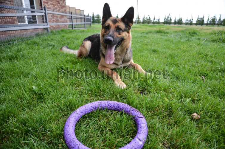 Собака породы овчарка во время передачи кинологическим центром, расположенном в Межигорье, пограничному ведомству немецких овчарок, которые будут использоваться в служебной деятельности на государственной границе и в зоне проведения АТО, в Межигорье, 30 июля 2015 г. Фото Нужненко Сергей / УНИАН