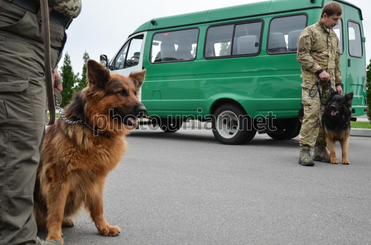 Руководитель кинологического центра "Межигорье" Николай Гарус с овчаркой во время передачи кинологическим центром, расположенном в Межигорье, пограничному ведомству немецких овчарок, которые будут использоваться в служебной деятельности на государственной границе и в зоне проведения АТО, в Межигорье, 30 июля 2015 г. Фото Нужненко Сергей / УНИАН