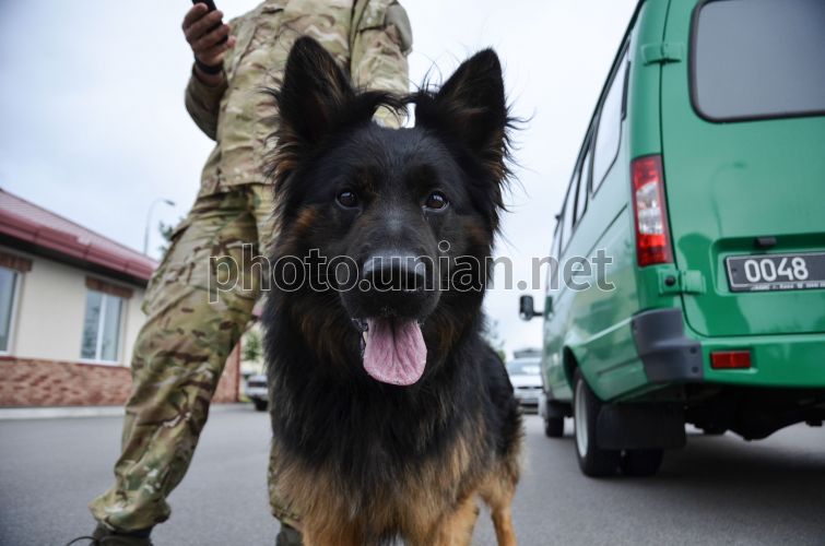 Собака породы овчарка во время передачи кинологическим центром, расположенном в Межигорье, пограничному ведомству немецких овчарок, которые будут использоваться в служебной деятельности на государственной границе и в зоне проведения АТО, в Межигорье, 30 июля 2015 г. Фото Нужненко Сергей / УНИАН