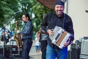 Лидер группы "Terrance Simien and Zydeco Experience" Терренс Симиен с рэббордом во время концерта группы на летней эстраде киевского Городского сада в Киеве, 31 июля 2015 г. В этот день на летней эстраде киевского Городского сада при поддержке посольства США в Украине в рамках проекта "Kyiv Open Air", серии концертов "Мушля джаз уікенд", прошел концерт группы "Terrance Simien and Zydeco Experience". Фото УНИАН