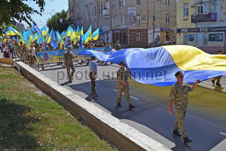 Митинг по случаю Дня ВДВ в Виннице, 2 августа 2015 г. В Виннице колонна ветеранов ВДВ и действующих десантников и спецназовцев прошли по центральной улице города выкрикивая: "Слава Украине! - Героям слава!". Участники празднования Дня высокомобильных десантных войск собрались на Европейской площади города, возложили цветы к вечному огню, памятнику Памяти небесной сотни и Героев АТО и Воинам "афганцам". Фото Агеев Андрей / УНИАН
