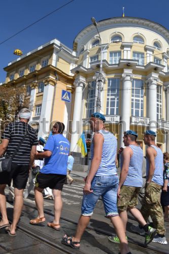 Митинг по случаю Дня ВДВ в Виннице, 2 августа 2015 г. В Виннице колонна ветеранов ВДВ и действующих десантников и спецназовцев прошли по центральной улице города выкрикивая: "Слава Украине! - Героям слава!". Участники празднования Дня высокомобильных десантных войск собрались на Европейской площади города, возложили цветы к вечному огню, памятнику Памяти небесной сотни и Героев АТО и Воинам "афганцам". Фото Агеев Андрей / УНИАН