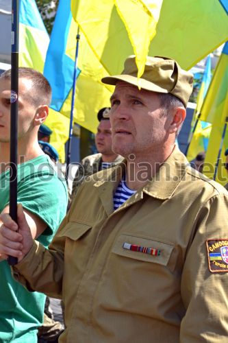 Митинг по случаю Дня ВДВ в Виннице, 2 августа 2015 г. В Виннице колонна ветеранов ВДВ и действующих десантников и спецназовцев прошли по центральной улице города выкрикивая: "Слава Украине! - Героям слава!". Участники празднования Дня высокомобильных десантных войск собрались на Европейской площади города, возложили цветы к вечному огню, памятнику Памяти небесной сотни и Героев АТО и Воинам "афганцам". Фото Агеев Андрей / УНИАН