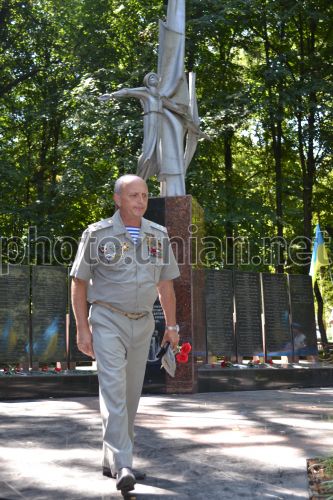 Возложение венков и цветов к памятнику "Воинам "Афганцам" от земляков-подолян" в рамках празднования Дня ВДВ на Европейской площади в Виннице, 2 августа 2015 г. В Виннице колонна ветеранов ВДВ и действующих десантников и спецназовцев прошли по центральной улице города выкрикивая: "Слава Украине! - Героям слава!". Участники празднования Дня высокомобильных десантных войск собрались на Европейской площади города, возложили цветы к вечному огню, памятнику Памяти небесной сотни и Героев АТО и Воинам "афганцам". Фото Агеев Андрей / УНИАН