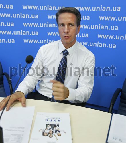 Автор учебного пособия "Курс юного патриота" Максим Колесниченко во время презентации первого в Украине учебного пособия по патриотическому воспитанию "Курс юного патриота", в агентстве УНИАН, в Киеве, 26 августа 2015 г. Фото Синица Александр / УНИАН