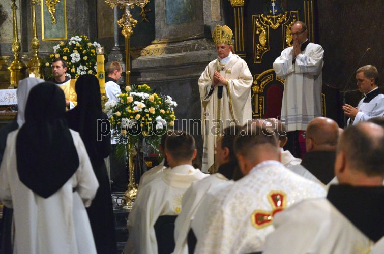 Митрополит Львовский РКЦ Мечислав Мокшицкий, в центре, во время Святой Мессы по случаю открытия Ассамблеи монашества УГКЦ и РКЦ "Увидел две лодки" во Львове, 14 сентября 2015 г. Фото Шмаков Валерий / УНИАН