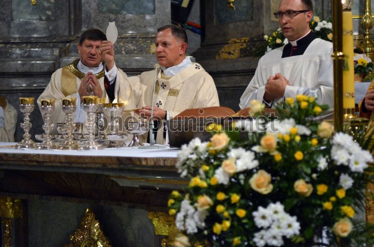 Митрополит Львовский РКЦ Мечислав Мокшицкий, в центре, во время Святой Мессы по случаю открытия Ассамблеи монашества УГКЦ и РКЦ "Увидел две лодки" во Львове, 14 сентября 2015 г. Фото Шмаков Валерий / УНИАН