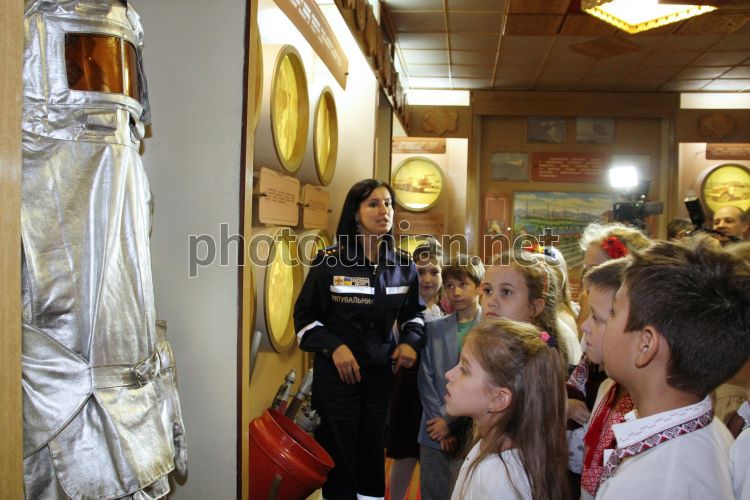 Начальник отдела информации и коммуникаций с общественностью ЦЗД Управления ГСЧС в области Ирина Луцик проводит экскурсию по музею пожарной части №1 по случаю празднования Дня пожарного для учеников четвертого класса пятого школы Ивано-Франковска, 16 сентября 2015 г. По случаю празднования Дня пожарного в пожарной части №1 в Ивано-Франковске был проведен День открытых дверей. Фото Кашуба Тарас / УНИАН