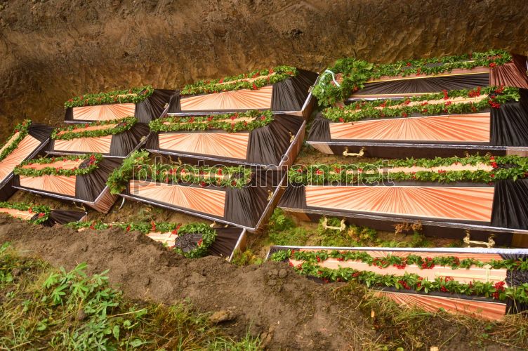Перезахоронение останков жертв НКВД на кладбище в с. Езуполь (Ивано-Франковская обл. ), 20 сентября 2015 г. Замученных НКВД перезахоронили на Прикарпатье. Братскую могилу жертв сталинского террора нашли случайно в поселке Езуполь. Всего 225 останков, среди них – 54 детских. Раскопки продолжались почти четыре года. Останки лежали, сброшенные на кучу и пересыпанные известью в яме возле больницы в Езуполе. С 44-го по 57-й годы, где сейчас в Езуполе больница, располагался гарнизон и тюрьма НКВД. По словам историков, сюда привозили не только воинов УПА и подпольщиков ОУН, но и целые так называемые "неблагонадежные" семьи, которых должны были вывозить в Сибирь. Людей в езупольской тюрьме перед смертью жестоко пытали. На это указывают многочисленные переломанные кости и проломленые черепа. Могила, где перезахоронили жертв сталинского террора, пока будет безымянной. Сейчас их отпели по всем христианским канонам и по-человечески похоронили на поселковом кладбище. Фото Кашуба Тарас / УНИАН