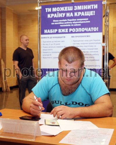 Молодой человек заполняет документы во время первого дня набора работников в новую полицейскую службу в Черкассах, 21 сентября 2015 г. В Черкассах 21 сентября начался набор работников в новую полицейскую службу. Отбор продлится 2 недели, после чего все, кто прошел кастинг, будут учиться на базе Черкасского института пожарной безопасности имени Героев Чернобыля, где будут проходить лекции и уроки по физической подготовке. Всего в Черкассах планируют привлечь к службе в полицию 400 человек. Планируется, что в конце ноября или в начале декабря новые полицейские выйдут на патрулирование улиц города. Фото Шакин Дмитрий / УНИАН