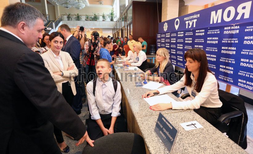 Министр внутренних дел Украины Арсен Аваков во время первого дня набора сотрудников в новую полицейскую службу в Черкассах, 21 сентября 2015 г. В Черкассах 21 сентября начался набор работников в новую полицейскую службу. Отбор продлится 2 недели, после чего все, кто прошел кастинг, будут учиться на базе Черкасского института пожарной безопасности имени Героев Чернобыля, где будут проходить лекции и уроки по физической подготовке. Всего в Черкассах планируют привлечь к службе в полицию 400 человек. Планируется, что в конце ноября или в начале декабря новые полицейские выйдут на патрулирование улиц города. Фото Шакин Дмитрий / УНИАН