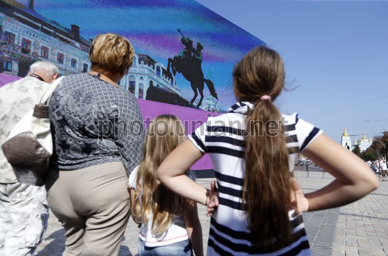 Арт-инсталляция с изображением Богдана Хмельницкого на Софийской площади в Киеве. 26 сентября 2015 г. Отечественные инженеры, используя современные технологии (LED-экраны общей площадью 305 квадратных метров), воплотили замысел, который позволил киевлянам и гостям города воочию увидеть, как Богдан Хмельницкий "ожил". Арт-инсталляция символизирует Украину, которая не стоит на месте. Фото Мусиенко Владислав / УНИАН