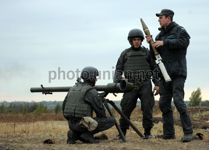 Курсанты 4-го курса Национальной академии Национальной гвардии Украины стреляют из станкового противотанкового гранатомета (СПГ-9) во время учебных стрельб на полигоне в пос. Башкировка (Чугуевский р-н Харьковская обл. ), 1 октября 2015 г. Фото Владимир Андреев / УНИАН